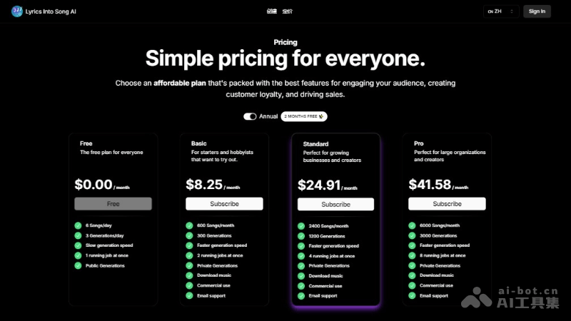 • 标准计划(每月24.91美元):每月2400首歌曲、每月1200次生成、更快的生成速度、一次可以运行四个生成任务、私人生成、音乐下载、商业用途、电子邮件支持